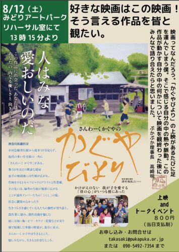 8月12日(土)みどりアートパークリハーサル室で『かぐやびより』の上映会をやります。 この映画の舞台『さんわーくかぐや』に先日行ってきました。 朝から寝ている人達と、よく働く人達が混在しているところがいいなと思いました。 お互い無理がない。そのせ…