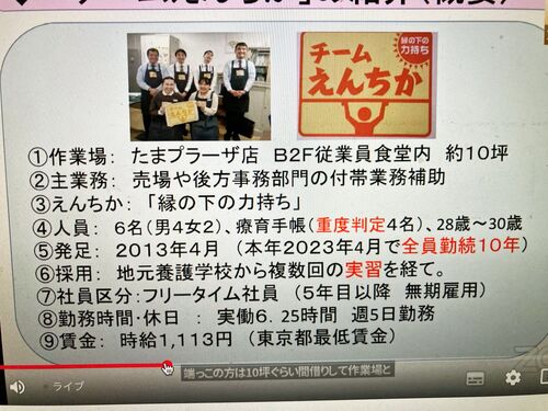 「障がいのある人達と共に働く社会」と題した東急百貨店の「えんちか」の報告がありました。 「2013年4月、横浜市内の東急百貨店たまプラーザ店に障害者中心の部署として新設。 ”縁の下の力持ち”を意味して名づけられた。神奈川県内の養護学校を卒業し…