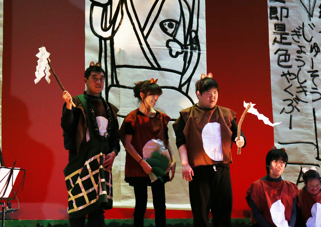 ぷかぷかさんと接してきておもしろかったり、ときにはむっとしてしまったり、いろいろあったけれど、何よりも僕は人前で表現するとかが嫌で嫌で、そこから逃げていた自分だったように思う。リハーサルの日もそう。僕にも役があり、しかもオオカミのかぶりものまであるとわかったとき、やっぱり今日は部活にいっておけばよかったなと後悔した。舞台に立つなんてなれないことに身体はどっと疲れた。しかし、ぷかぷかさんたちはニコニコ元気、とてもいい笑顔だった。疲れた顔をしているのは僕だけで「なんでこの人たち笑っていられるんだろう」と不思議だった。その姿を見ていて、ぷかぷかさんたちはやらされてるとかでなくて、自由にありのままの姿で表現することを楽しんでいる。特に一緒にオオカミ役をやったしょうくん(こうきくん)が♪なんでもいいから一番になーれ♪と歌っている姿がきらきらと輝いてとっても印象的だった。僕にはやらされているという気持ちがずっとどこかにあった。ぷかぷかさんと僕の違いはそういう心の違いだと思った。