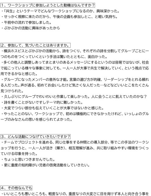 神奈川ネット主催で「ともに生きる社会」をテーマに研修会をやりました。ただ話し合っても、ほとんど何も残らないので、ぷかぷかの映画『Secret of pukapuka』を見たあと、詩のワークショップをやりました。それぞれ気づいたことを5,6行の短い詩に書き、それをグループで共有したあと、それぞれの言葉を切り離し、グループの中で並べ替え、グループの詩として編集し直します。編集し直す段階で、それぞれの考え方が対立することもあって、ここがいちばんおもしろいのですが、今回は似たような考え方の人が集まっていたのか、すんなりまとまってしまいました。